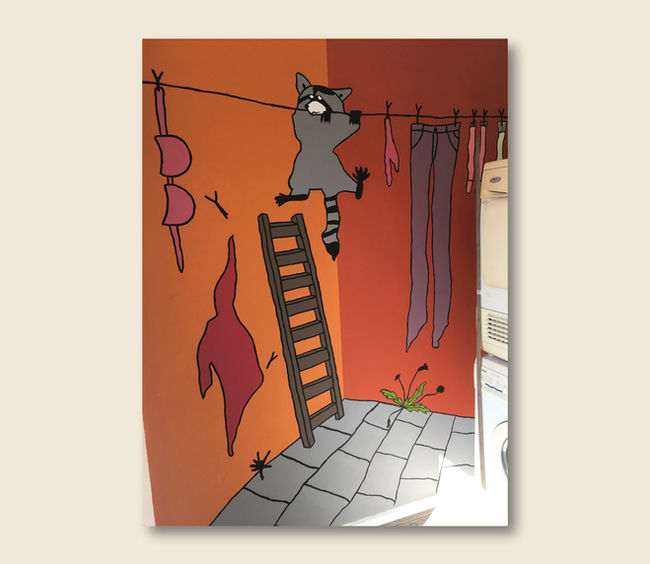 Ik werd benaderd voor een ander soort werk in opdracht door Jonatan en Isabel, die graag een muurschildering wilde van een wasbeer in hun waskamertje. Deze brutale wasbeer klimt langs de waslijn en gooit alle schone was naar beneden! Door het effect van de stoep en de twee achtergrondkleuren lijkt het mini kamertje ook een beetje groter.